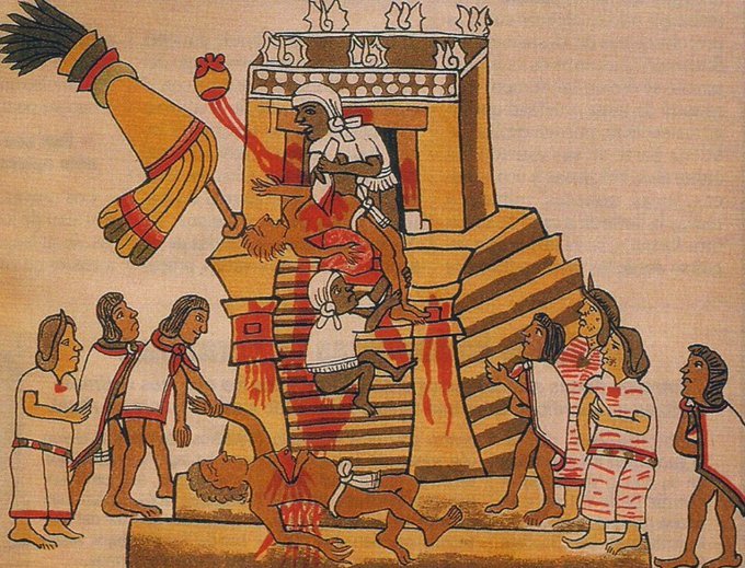 «Y con unos navajones de pedernal les aserraban los pechos y les sacaban los corazones buyendo, y los cuerpos dábanles con los pies por las gradas abajo, y se comían las carnes con chimole.»